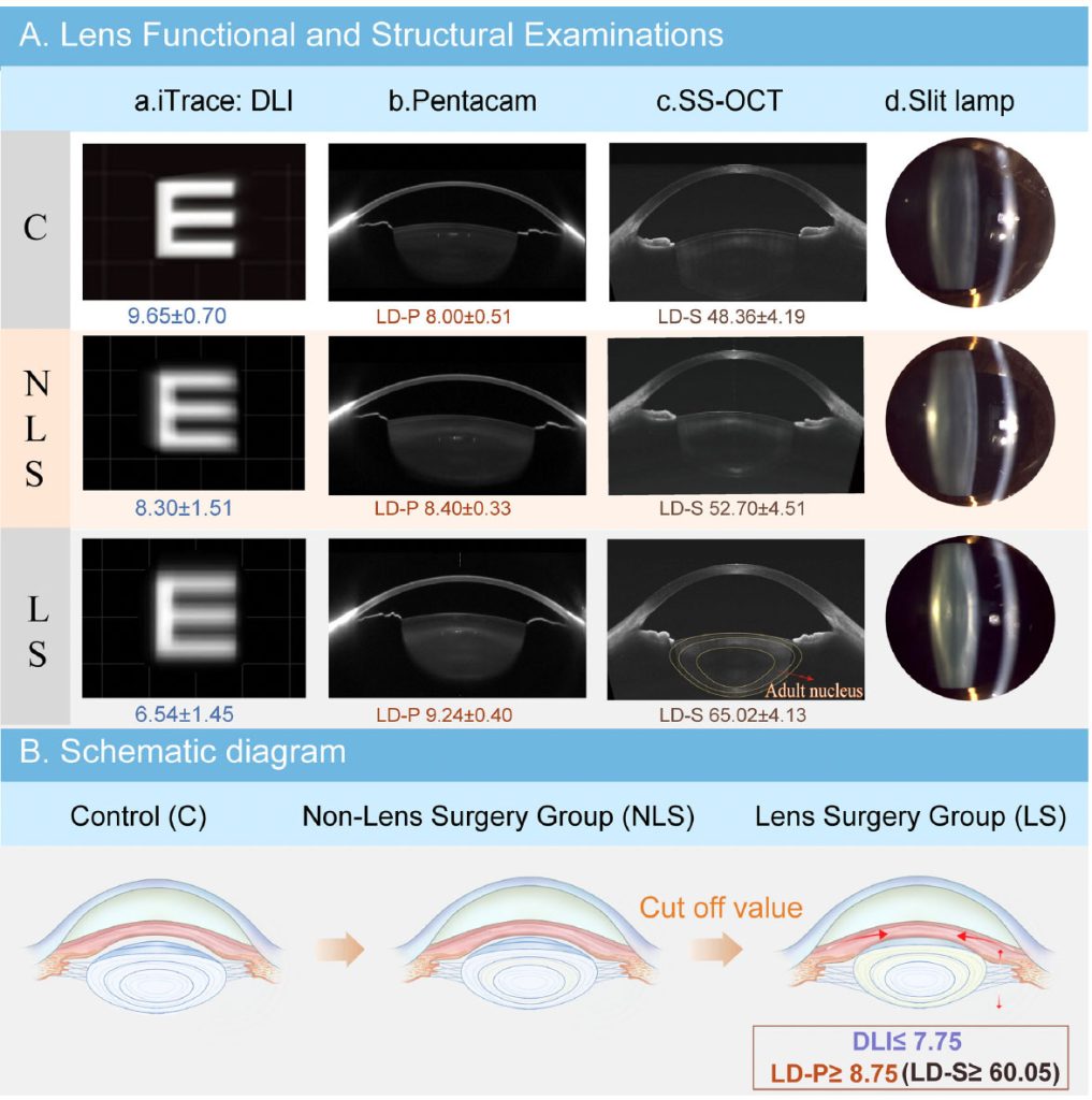 Resultat: Totalt analyserades 352 ögon från 176 personer (medelålder 46,1 ± 6,2 år). Presbyopi diagnostiserades i 268 ögon (76,1 %), varav 14 uteslöts p.g.a. hög variabilitet. Av resterande ögon hamnade 138 (51,5 %) i NLS och 116 (43,3 %) i LS. LS-gruppen hade lägre DLI och högre linsdensitet (alla P < 0,001). Optimala gränsvärden var: DLI = 7,75, LD-P = 8,75, LD-S = 60,05. Kombinerat DLI och LD-P gav bäst diagnostisk träffsäkerhet.